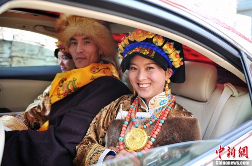 图为坐上婚车新娘江明芳脸上露出欢喜的笑容。