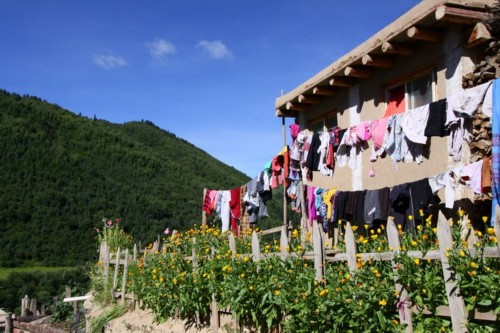 这是位于上村的一个观景台在观景台能看到村外的一片开阔河谷老张一行便是沿河谷边的公路进入神座村的藏民族应该是一个喜欢花的民族。