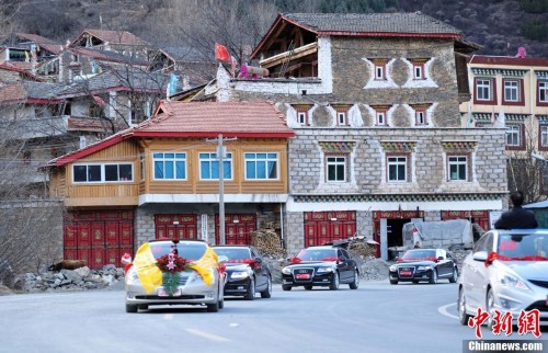 图为如今藏区年轻人结婚也用轿车迎接新娘。