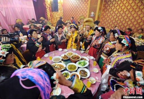 图为婚礼上新人向亲朋敬酒表感谢。