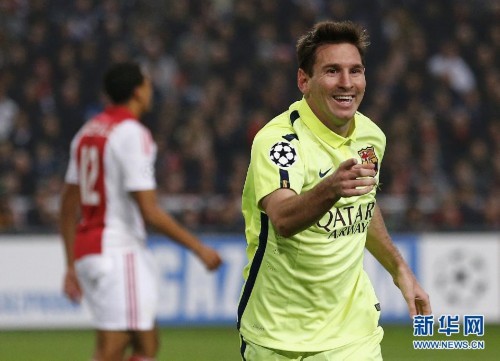 图为11月5日,巴塞罗那队球员梅西在2014/15赛季欧洲足球冠军联赛F组第四轮比赛中庆祝进球。 新华社发