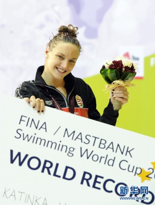 图为8月27日,匈牙利选手霍苏在颁奖台上。当日,在卡塔尔首都多哈进行的2014年国际泳联短池游泳世界杯系列赛多哈站女子200米混合泳决赛中,匈牙利选手霍苏以2分02秒61的成绩获得冠军,并创造了短池世界纪录和世界杯纪录。新华社发