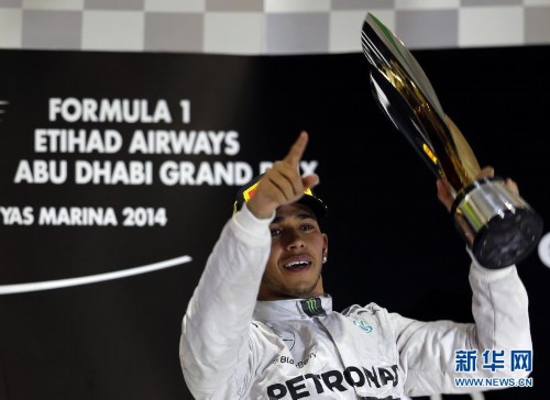 图为11月23日,梅赛德斯车队的英国车手汉密尔顿在世界一级方程式赛车锦标赛(F1)收官之战——阿布扎比站的颁奖仪式上庆祝。新华社发