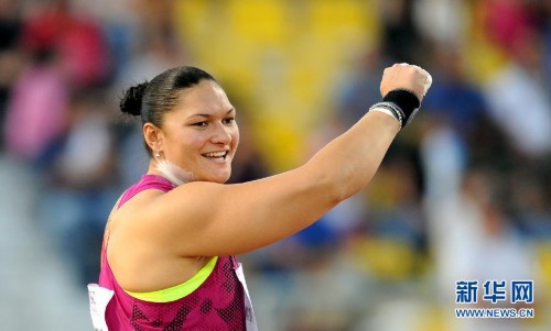图为5月9日,新西兰选手亚当斯在卡塔尔首都多哈进行的2014年国际田联钻石联赛女子铅球决赛中庆祝。 新华社发