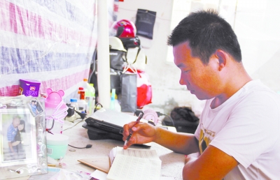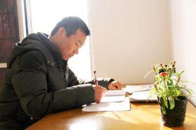2014年9月16日,常松在旧教室改成的寝室里批改作业。