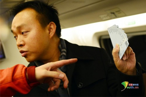 2015年1月12日,D9022次列车上,陈先生展示其购买的车票,他一次性购买了周一到周五的往返燕郊和北京的10张动车票。当天,燕郊站开往北京站的动车首发。
