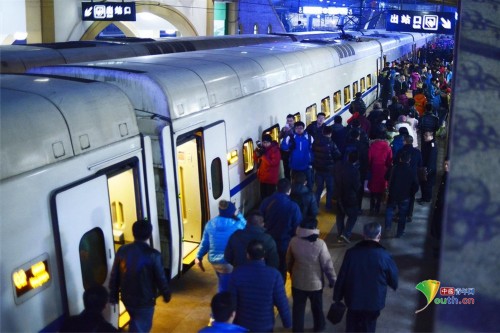 2015年1月12日,北京站,D9022到站后,乘客下车。当天,燕郊站开往北京站的动车首发。