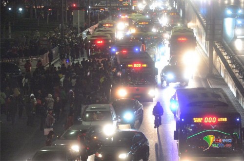 动车开通前,记者在晚高峰时段华贸桥下的公交车站拍摄的燕郊返程客流。昨天动车开通后,同时段、同地点,人流并没有减少。
