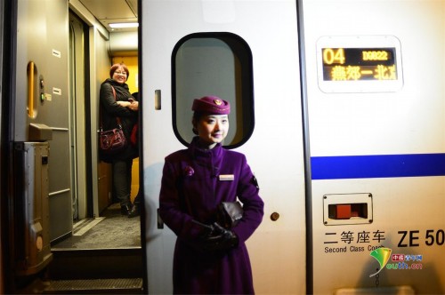 2015年1月12日,燕郊站,乘客在等待D9022次列车发车。当天,燕郊站开往北京站的动车首发。