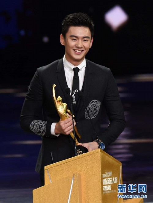 2月1日,中国游泳队队员宁泽涛在颁奖典礼上。宁泽涛因在仁川亚运会上一人独得四金而获得年度最佳男运动员奖。当日,“2014CCTV体坛风云人物年度评选”颁奖典礼在京举行。新华社记者公磊摄