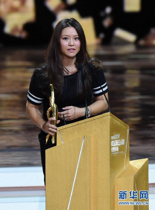 2月1日,网球名将李娜在颁奖典礼上发表获奖感言。李娜因获得2014年澳网女单冠军而荣获年度最佳女运动员奖。当日,“2014CCTV体坛风云人物年度评选”颁奖典礼在京举行。新华社记者公磊摄