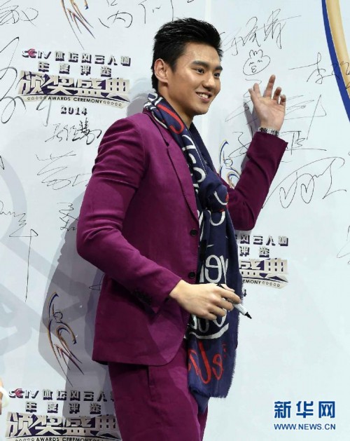 2月1日,中国国家游泳队队员宁泽涛在颁奖典礼红毯仪式上。当日,“2014CCTV体坛风云人物年度评选”颁奖典礼在京举行。新华社记者公磊摄