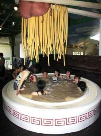 位于箱根的一家温泉度假村推出特制的“拉面温泉”。投入温泉汤池中的“拉面”是用润肤胶质和大蒜精油等制作的。在汤池中,“拉面”逐渐溶化,并佐以马油、胡椒油等“调味品”,使温泉具有滋润皮肤、促进消化、镇静止痛等功效。拉面温泉共有3个池子,白色的池壁外围描着一圈首尾相连的红色“回”字花纹,活脱脱一只特大号的面碗。