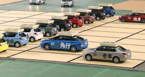 巨型棋盘上排列整齐的“轿车棋子”。(网站截图)
