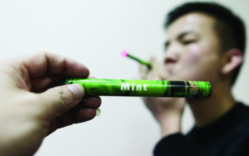 记者花15元买下了这支电子烟,电子烟比真烟要长和粗,除了顶部写着一圈英文标示,烟身上既无商标、品名,也无生产厂家标识。吸一口电子烟,“烟头”处不仅会发出红光,还能吐出薄荷味的烟气。吸食过后,口腔内会留有很强的薄荷味。