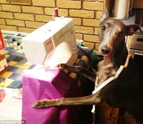 鲁珀特坐在缝纫机前,卷尺缠在在脖子上,它乐于帮助他的主人做家务。
