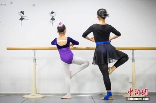 下午4点,赵蕴辉向一个小学员做芭蕾舞的示范动作。