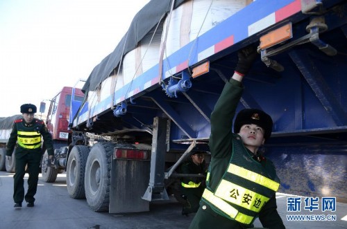 2月24日,内蒙古巴彦淖尔市乌拉特中旗甘其毛都口岸公安边防检查站官兵在对入境的蒙古国货运车辆进行查验。新春佳节期间,驻守在祖国北疆各边境口岸的内蒙古自治区公安边防官兵坚守口岸国门边检勤务一线,对出入境客货运人员、车辆进行依法查验,确保口岸通关和国际贸易运输安全。新华社记者张领摄