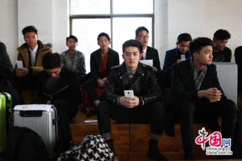 3月1日,山东艺术学院服装表演专业候考室,等候上场的刘达(前排中)。他1997年生,山东青岛人,报考浙江理工大学、厦门理工大学、上海工程技术大学、山东艺术学院、北京服装学院等8所高校表演的服装专业。(中国网图片库摄影师郭志华)