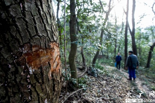 2015年3月1日,杭州西湖边的凤凰山上,大批树木躯干上都被利器刻出标记,疑为自行车山地速降赛和山地越野跑遗留。