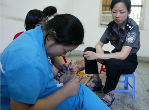 6月25日清晨6点,武汉市第一看守所内,女警和普通女犯正帮毒贩死囚李菊花涂抹鲜红的脚趾油