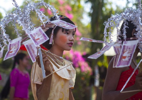 男孩的姐姐跟在后面,金箔装饰的伞上还挂着钱。(网页截图)
