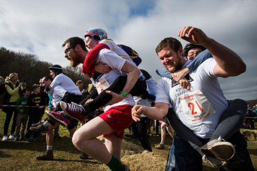 英国Dorking日前举办了一年一度的“背老婆大赛”,参赛者要扛着一名女伴跑完380米路程,其中还有15米的上坡路。