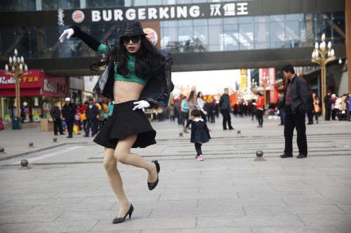3月13日,内蒙古包头市,一名身着女士服装的男子在包百步行街附近摆摊跳舞,引发过路行人围观,据男子介绍,他来自内蒙古包头市萨拉齐农村,母亲患有顽疾,自己由于家庭经济困难而决定走上街头卖艺来赚取母亲的医药费。