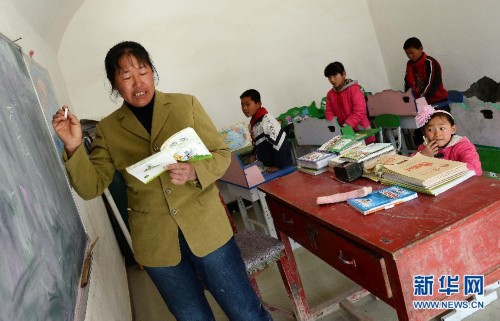 杨增叶给孩子们上课(3月17日摄)。 51岁的民办教师杨增叶,是陕西省横山县南塔镇高圪垯村小学唯一的一名老师,从1996年站上教师讲台开始,她默默坚守在这个黄土高原深处的乡村小学长达19年。 2005年因撤点并校,原本130多人的学校面临关闭,在学生家长的请求下,为了不让一些因特殊条件无法去镇上上学的孩子们辍学,杨增叶在其他老师离开后,开始了长达10年的独自教学。高圪垯村地理位置偏僻,离最近的镇子也要15公里,原本800多人的村庄,现在只有约200人居住,学校里也只剩下9个学生。杨增叶每天除了给4至14岁不同年级的学生上课,还要照料他们的生活,村里人都说她既当老师又当妈妈。作为民办教师,杨增叶全年的收入只有一万多元。因丈夫长年不在家,两个儿子又在外工作,家里的20多亩地全靠杨增叶一人打理。对于高圪垯小学的未来,杨增叶说:“只要还有一个学生上学,只要自己的身体还允许,我就一定会坚持下去。” 新华社记者 刘潇摄
