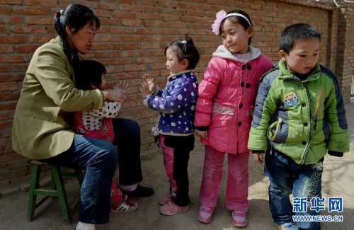 午饭后,杨增叶带着孩子们在室外活动(3月17日摄)。 51岁的民办教师杨增叶,是陕西省横山县南塔镇高圪垯村小学唯一的一名老师,从1996年站上教师讲台开始,她默默坚守在这个黄土高原深处的乡村小学长达19年。 2005年因撤点并校,原本130多人的学校面临关闭,在学生家长的请求下,为了不让一些因特殊条件无法去镇上上学的孩子们辍学,杨增叶在其他老师离开后,开始了长达10年的独自教学。高圪垯村地理位置偏僻,离最近的镇子也要15公里,原本800多人的村庄,现在只有约200人居住,学校里也只剩下9个学生。杨增叶每天除了给4至14岁不同年级的学生上课,还要照料他们的生活,村里人都说她既当老师又当妈妈。作为民办教师,杨增叶全年的收入只有一万多元。因丈夫长年不在家,两个儿子又在外工作,家里的20多亩地全靠杨增叶一人打理。对于高圪垯小学的未来,杨增叶说:“只要还有一个学生上学,只要自己的身体还允许,我就一定会坚持下去。” 新华社记者 刘潇摄