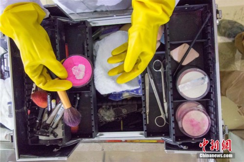 从冷藏库里搬运出遗体、核实身份,接着给逝者穿衣化妆,最后通过升降梯将遗体运送至告别厅,是他们的主要内容。图为遗体化妆师工作用的遗体化妆用具。黄威铭摄