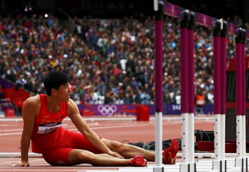 2012年伦敦奥运会男子110米栏预赛拉开战幕。刘翔在第六小组出战,结果中国飞人在攻第一个栏的时候出现失误,重重摔倒在地上直接退出了比赛。比赛结束之后,刘翔右脚严重受伤,不过他仍然坚持着单脚跳过了终点线。最后,刘翔坐着轮椅离开了赛场,结束了自己的第三次奥运会之旅。