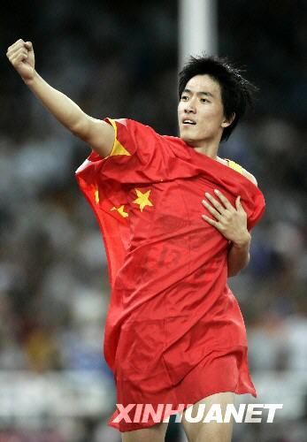 2004年8月27日,中国选手刘翔在雅典奥运会男子110米栏比赛中夺得金牌。这是刘翔在夺冠后身披五星红旗庆贺(资料照片)。