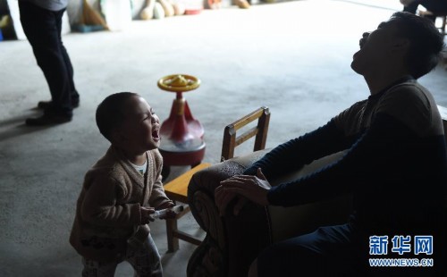在广西大化瑶族自治县大化镇景山村,韦康仁(右)和弟弟韦康虎在玩打针游戏(2月22日摄)。健康快乐地去上学。新华社记者黄孝邦摄