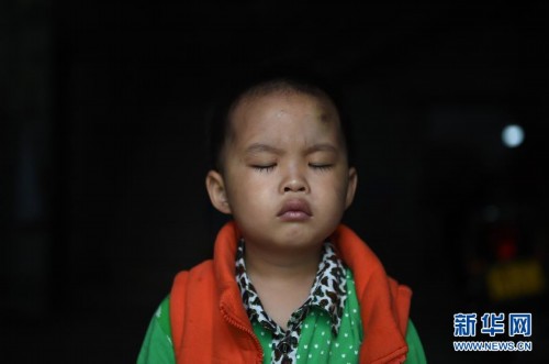 在广西大化瑶族自治县大化镇景山村,3岁的韦康虎站在家门口,身体虚弱让他经常感到头晕(4月1日摄)。新华社记者黄孝邦摄