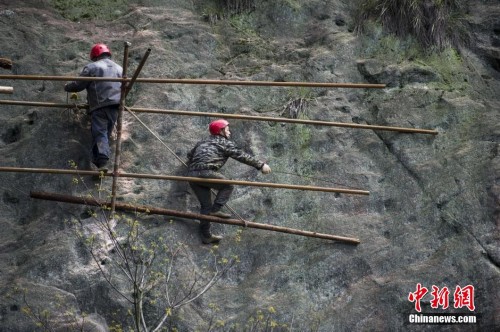 两位搭架工在悬崖峭壁上配合作业,稍有差池都将会危及生命。杨华峰摄