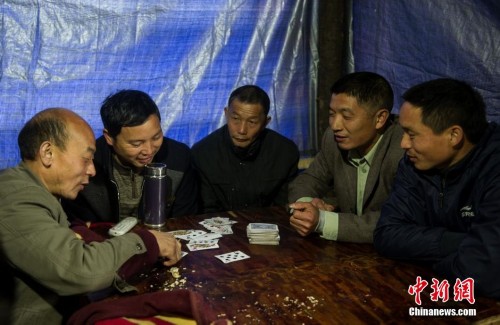 在住处,玩扑克牌成为了工人们唯一的娱乐方式。杨华峰 摄