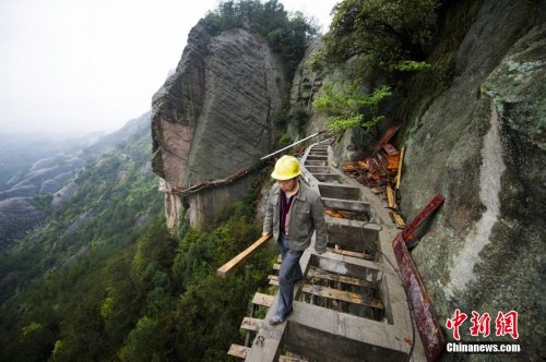 一位工人行走在悬崖边。杨华峰 摄