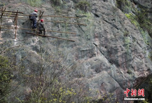 张敬发(图右)就像“蜘蛛侠”一般吊挂在绝壁上。杨华峰摄