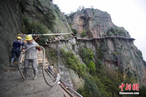 两位工人正在栈道上进行浇筑混凝土。杨华峰 摄