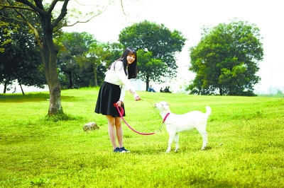 武汉纺织大学服装学院的学生牵着小白羊在校园里遛弯儿。
