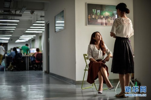 燕子(左)定期回公司和繁星网的主播管理人员交流,了解公司的最新规定和数据部门对自己粉丝变化的技术分析(4月27日摄)。新华社记者刘大伟 摄