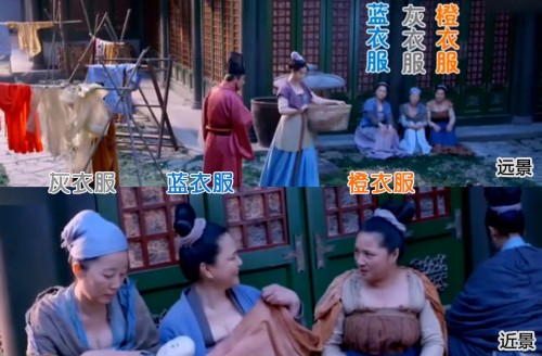 武如意被贬到掖庭洗衣房,太监在给武如意介绍洗衣房情况的时候,旁边地上坐着的三个女人,顺序依次为:蓝衣服-灰衣服-橙衣服,可是到了拍这三个人的特写时,顺序则突然间变成了:灰衣服-蓝衣服-橙衣服。