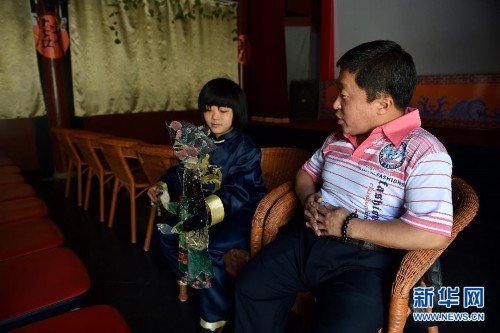 5月4日,在袖珍人皮影戏馆,袖珍人皮影剧团创建人白长茂(右)在和演员聊天。新华社记者 詹彦 摄