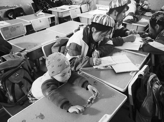 有时候学习成绩好的女学生会帮助老师带孩子,或是带着自己的弟弟、妹妹到班里一起上课。 麦尔旦·吐拉江/摄