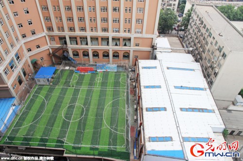 2015年6月3日,河南省郑州市,这个“空中足球场”位于紫荆山路与城北路交叉口处的一座商业楼的二楼平台,为钢筋混凝土“森林”增添了一抹绿色和生机。这个“空中足球场”场地面积约900㎡,是郑州市一位名叫徐聪的足球爱好者和两个小伙伴利用一个废弃的网球场改建的,不图别的,就图自己玩着方便。(王威)