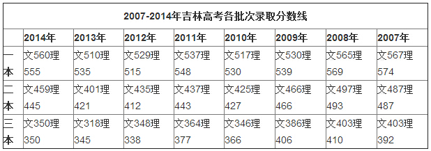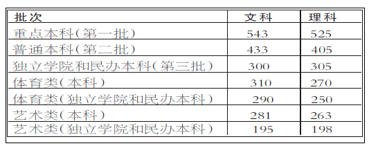 吉林省2015年普通高校招生本科各科类、批次录取最低控制分数线