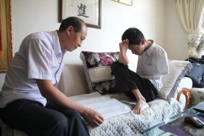 24日下午5点,是本科提前批次志愿填报截止时间。彭超和父亲坐在沙发上,彭超用脚翻阅着填报指南,仔细搜索着适合的学校和专业。
