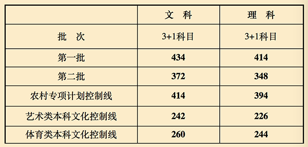 据上海教育考试院公布,2015年本市普通高校招生统一文化考试招生本科批次最低控制分数线如下:一批本科文科434分,理科414分;二批本科文科372分,理科348分;农村专项计划控制线文科414分,理科394分;艺术类本科文化控制线文科242分,理科226分;体育类本科文化控制分数线260分,理科244分。