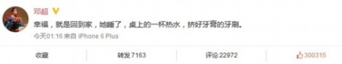 今日凌晨,邓超在上周被爆出轨后,难得正经秀恩爱,发文称“幸福,就是回到家,她睡了,桌上的一杯热水,挤好牙膏的牙刷。”随即,网友表示“莫名就湿了眼眶”。